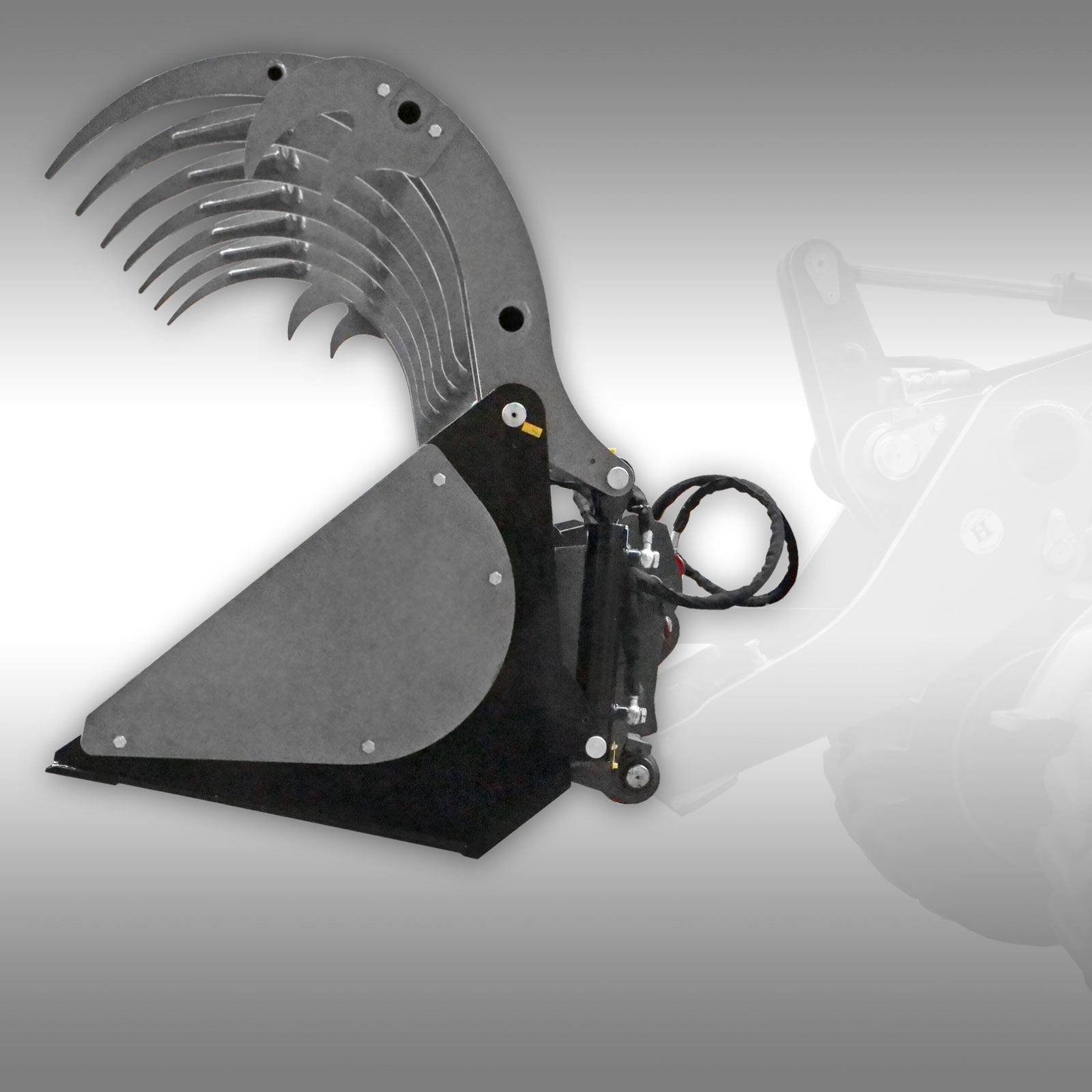 A largura de abertura das pás é de aproximadamente 90 cm. O desenho em forma de meia-lua do alicate superior evita que o material seja empalado. Ao remover os dois bolsos laterais, você pode usar esta pá, por exemplo, para transportar e pegar troncos de árvores ou outros materiais mais longos.