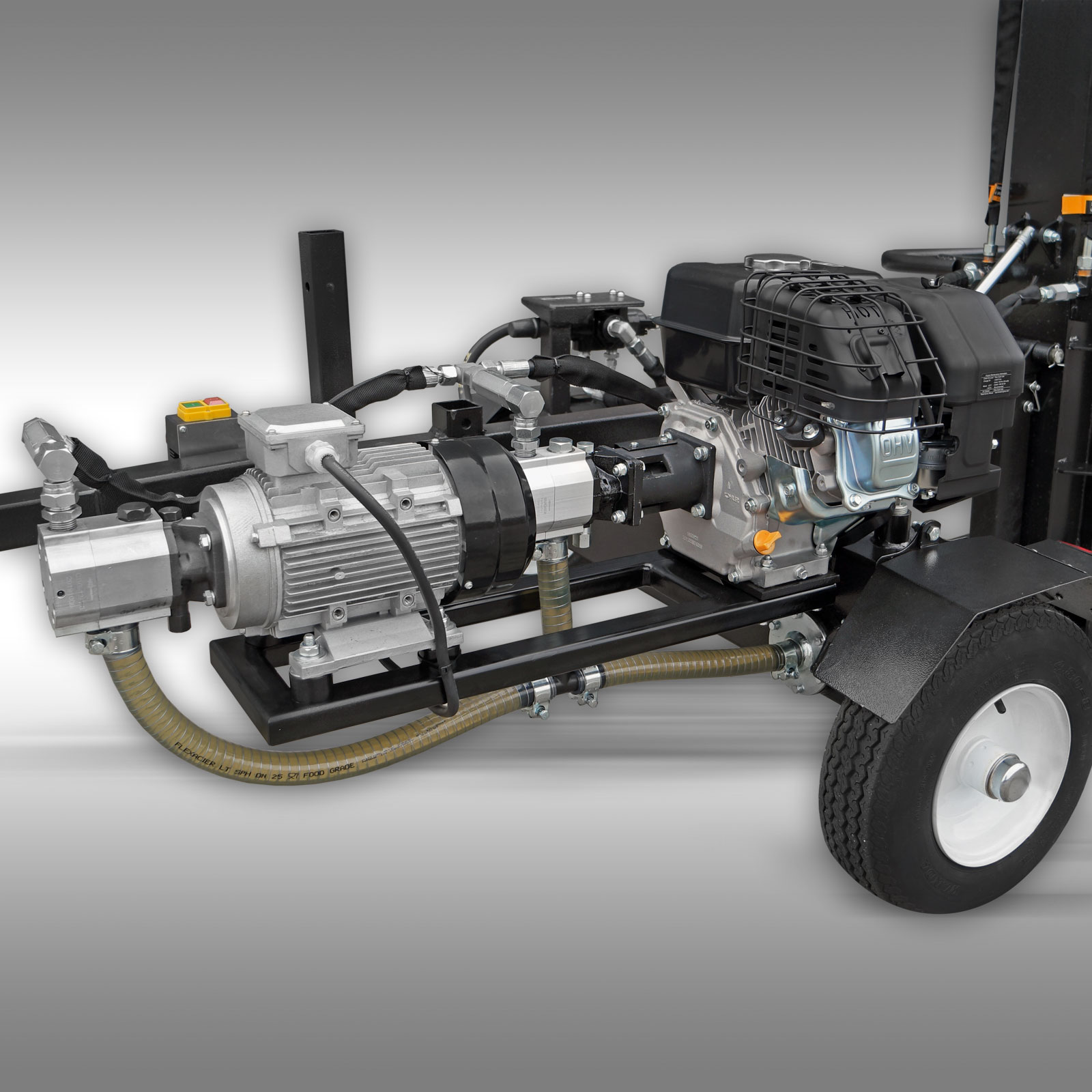 A bomba hidráulica é acionada por um motor a gasolina Kohler de 6,5 HP de alta qualidade muito robusto ou um motor elétrico potente (400 V, 2,2 kW). Você pode escolher entre tração elétrica ou tração a gasolina.