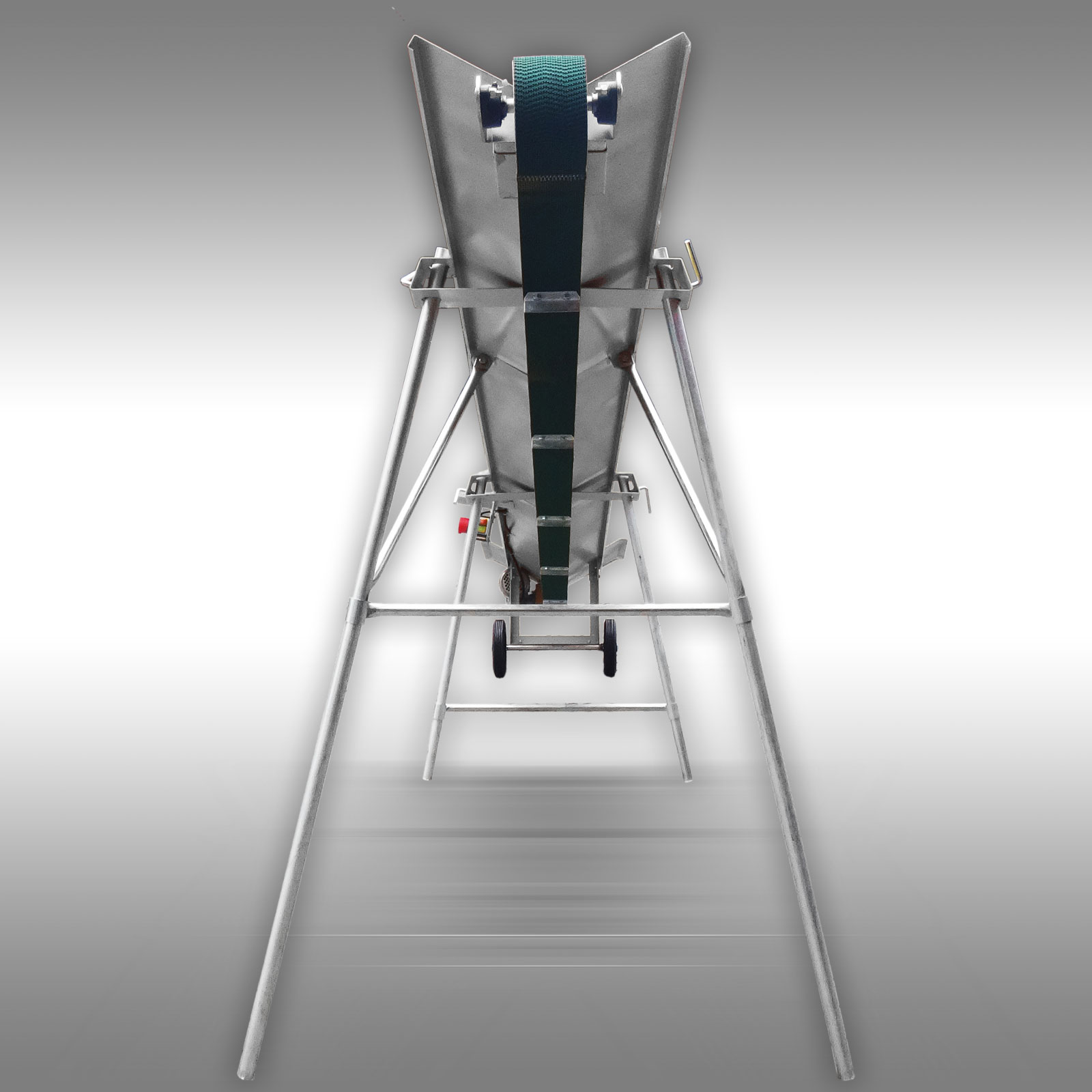 Os suportes, feitos de chapas dobradas de 3mm de espessura, garantem a taxa de alimentação correspondente. A correia de transporte funciona a uma velocidade de 0,8 m / s. A altura máxima de ejeção é de pouco menos de 2 metros.